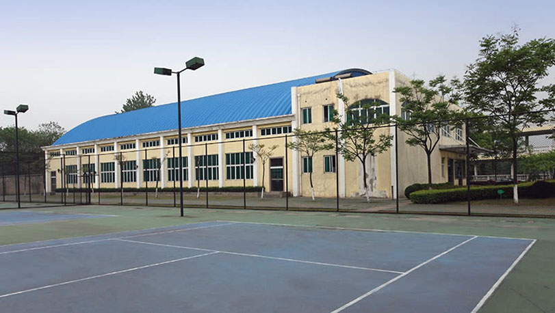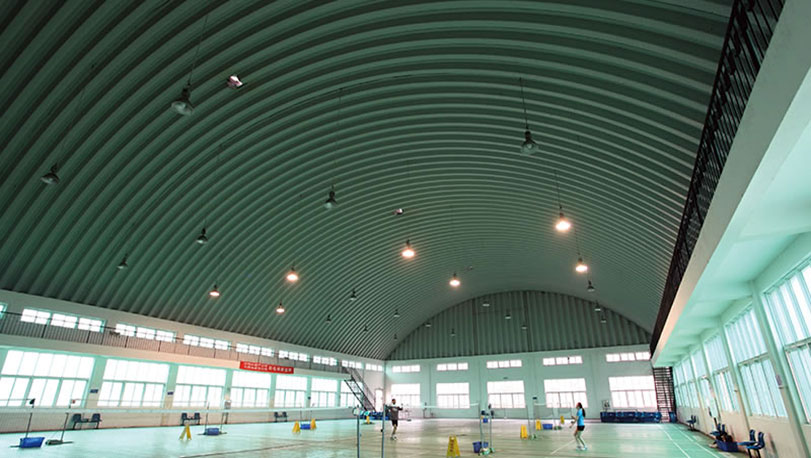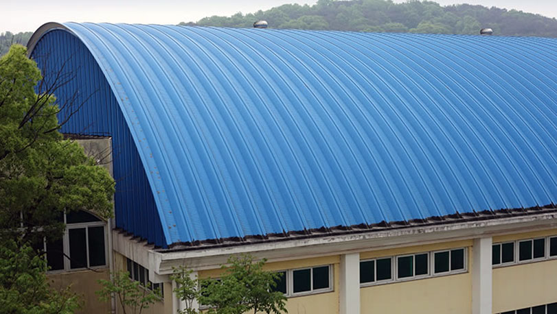 2003年建設(shè),拱型建筑。采用熱鍍鋅PE聚酯彩涂鋼板,顏色為海藍(lán)色,牌號(hào)為TS280GD,鍍鋅量180克/平方米。