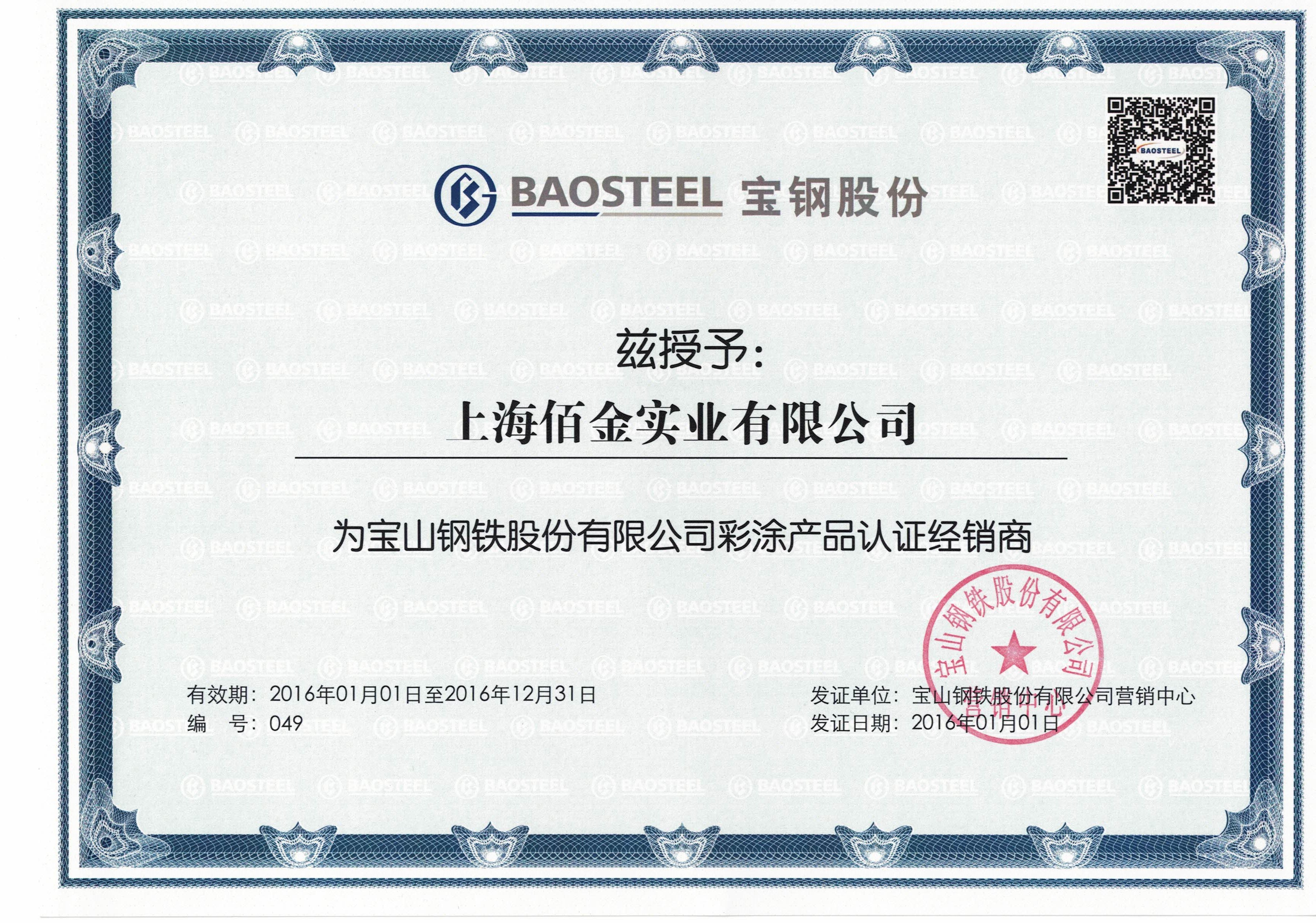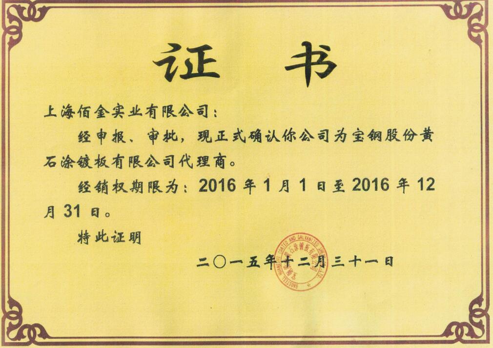 佰金華中銷售中心總公司上海佰金實(shí)業(yè)有限公司在幾年時(shí)間內(nèi),通過(guò)提供優(yōu)質(zhì)服務(wù),先后獲得了與寶鋼與寶鋼黃石等大品牌合作的機(jī)會(huì),獲取了他們的代理資格,代理證書如下:
