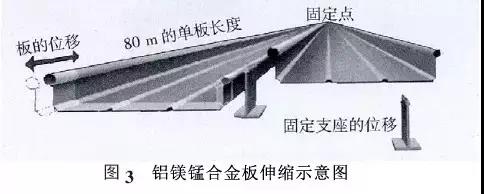 屋面板基材通常采用國際牌號AA3004 的鋁鎂錳合金壓型制作,合金狀態為H36/H46。其屈服強度≥190 MPa,抗拉強度在240~285 MPa,伸長率≥3%。收邊板基材采用國際牌號AA3004 的鋁鎂錳合金壓型制作,合金狀態為H34/H44,其屈服強度170MPa ,抗拉強度在220~265 MPa ,伸長率≥3%。