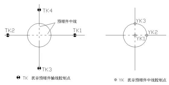 在設(shè)計圖紙上根據(jù)各預(yù)埋件的結(jié)構(gòu)中線確定YK1、YK2、YK3的位置,獲得其坐標值,在預(yù)埋件上做出YK1、YK2、YK3的標志。用全站儀極坐標法線定位YK1點,確定預(yù)埋件的中點位置,再用同樣的方法測定YK2、YK3的位置,控制預(yù)埋件的軸線方向。