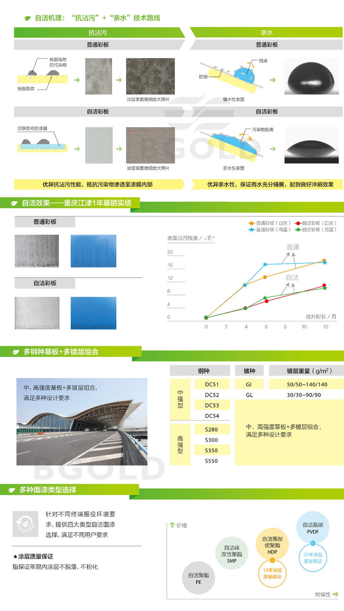 具有優異的抗沾污性能,能抵抗污染物滲透到漆膜內。優異的親水性能 保證了雨水充分展開于涂層表面,起到良好的沖刷效果。高裝飾性及優異的戶外耐久性! 特殊“親水+抗沾污”面漆結構設計,實現自我清潔! 多種面漆組合,滿足不同終端服役需求 中、高強度基本+不同鍍層組合,滿足多種設計要求! |